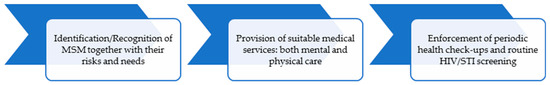 Figure 1 outlines the basic clinical process for recognizing and meeting the needs of the MSM population. Given that misunderstanding regularly happens among health workers when dealing with this group, the first step is to correctly identify the status of a man who have sex with man. Research has confirmed that healthcare providers knowledgeable of their patients’ sexual orientation and gender identity can lead to improved access, quality of care, and outcomes [51]. Indeed non-disclosure of MSM status to healthcare providers in Vietnam has been shown to cause suboptimal screening for HIV and sexually transmitted infections (STIs) and late detection of secondary transmission [29]. Once there has been correct recognition, health professionals can begin laying out the needed mental and physical care for the patients, which should be followed by periodic health check-ups and HIV/STI testing.