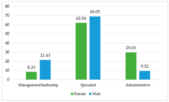 Although the percentage of female respondents to the survey is three times that of males, the majority of these female respondents work in administrative roles, whereas most male respondents hold management or specialist positions. Figure 2 illustrates this observation.