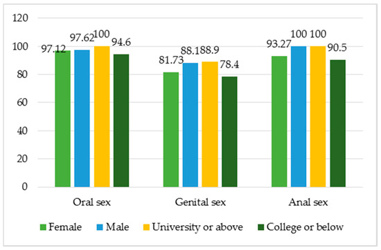The study finds a high percentage of health workers having correct understanding of the variety of sexual intercourses practiced by MSM, such as 97.3% agreeing with oral sex, 83.6% with genital sex, and 95.2% with anal sex. The number of male health workers who hold these correct understanding is higher than that of females (Figure 5). The same trend is seen in the group of those with university education or higher versus those with college or lower (Figure 5). No significant differences are seen between the two cities or when categorized by work positions or medical facilities.