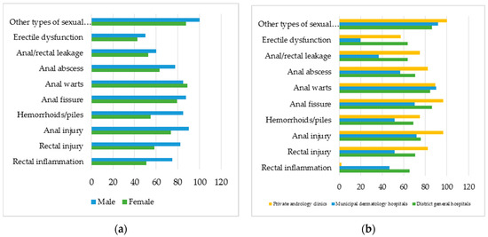 The percentage of respondents agreeing with common SRH issues facing transgenders as categorized by: (a) sex, and (b) medical facilities.