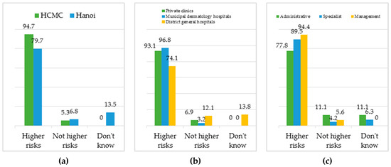 As Figure 7a shows, there is a gap of understanding between the health workers in Hanoi and Ho Chi Minh City (94.7% vs. 79.7%). This disparity is also observed in the different medical facilities, per Figure 7b, such that the district-level general hospitals seem to either underestimate the HIV risks or be completely unaware of such risks faced by this sexual minority group. By comparison, private clinics and municipal dermatology hospitals appear to be more knowledgeable of the transmission risks. When work positions are taken into account, as Figure 7c shows, there is also a considerable gap of understanding, with more people holding management/leadership and specialist roles being informed about the transgenders’ HIV risks than those in administrative positions.