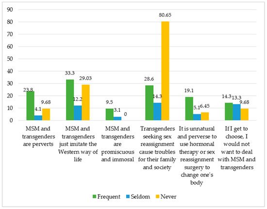 The percentage (%) of respondents who agree with the statements about transgenders.