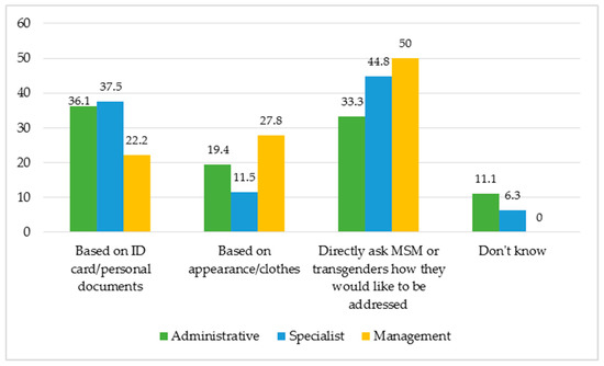 The results from the survey corroborate this insight. There is a higher percentage of health workers in administration who show a lack of sensitivity when interacting with MSM and transgenders, with 36%. While for people in leadership/management position or specialists, there is a higher percentage who understand asking MSM and transgenders how they’d like to be addressed is something one ought to do (50% and 44% respectively), as shown in Figure 9.