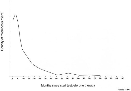 The density of thrombotic events was greatest at 3 months after starting TT, with a rapid decline in events by 10 months. Finding a peak of VTE events at 3 months after starting TT was entirely congruent with the population study by Martinez et al. [31].