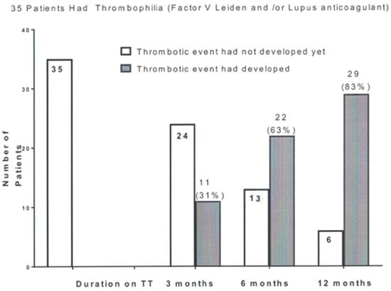 As displayed in Figure 2, of the 88 patients, there were 35 who had FVL heterozygosity and/or the lupus anticoagulant. After 3, 6, and 12 months on TT, 11 (31%), 22 (63%), and 29 patients (83%) were removed from the cohort, having sustained VTE events (Figure 2). This removal of susceptible subjects [32] may account for the peaking of VTE event rates at 3 to 6 months, followed by a rapid decline (Figure 1). Sixty-five percent of the thrombotic events occurred in a time frame ranging from <1 month to 8 months after starting TT. Martinez et al. [31] have also commented that the pattern of VTE events peaking rapidly in the first 3 months and declining gradually thereafter [31] may account for the underestimation of the association between TT use and VTE, as in a recent case-control study [33]. This would leave over time a thrombophilia-winnowed residual group with progressively fewer VTE events (Figure 2).
