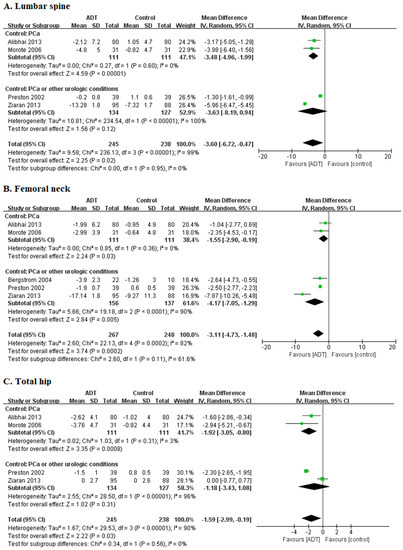 Forest plots comparing ADT and control groups. (A) Lumbar spine. (B) Femoral neck. (C) Total hip. ADT, androgen deprivation therapy; PCa, prostate cancer; Green box, weight; Central line of diamond, mean difference; Lateral tips of diamond, confidence intervals.