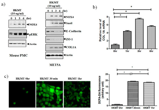 To study of the effect of HKMT on NOX4 production, mouse PMCs and human Met5A cells were incubated with HKMT (10 ng/mL) for 1–6 h. As shown in Figure 1, HKMT treatment increased the expression of NOX4 protein and the production of collagen RNA and protein. Mesothelial cells undergo epithelial to mesenchymal transition (EMT) in the process of tuberculous pleurisy and the transcription factor snail is an inducer of EMT process [20]. The HKMT treatment upregulated snail expression and decreased the expression of epithelial markers, E-cadherin and Zo-1 protein in Met5A cells. The HKMT increased the phosphorylation of ERK 1/2 protein in PMCs. The intensity of DCFA–DA-labeling ROS in the PMCs was also markedly elevated in the HKMT group.