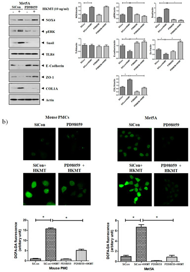 NOX4 mediates HKMT-induced EMT and intracellular ROS production via activation ERK signaling. PMCs were treated with HKMT in the presence or absence of the ERK inhibitor (PD98059). (a) Western blotting analyses of NOX4, phosphorylated ERK, collagen, and EMT markers. (b) Representative photomicrographs of cells subjected to DCFA–DA treatment * p < 0.05. Data are presented as the mean ± SD of three independent experiments. NOX, NADPH oxidase; EMT, epithelial to mesenchymal transition; COL1A, Collagen 1A.