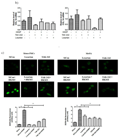 The binding of Ang II to its receptor is associated with intracellular free radical generation and tissue damage [21]. Several studies have suggested that NOX4 plays a critical role in the TLR4 downstream signaling cascade [22,23]. We studied the role of Ang II type 1 receptor (AT1R) and TLR4 in NOX4-mediated collagen synthesis in PMCs after HKMT treatment. Losartan (an AT1R antagonist) and TAK-242 (a TLR4 inhibitor) prevented the HKMT-induced increase in NOX4 and collagen synthesis in mouse PMCs and human Met5A cells (Figure 4a,b). Similarly, both decreased the levels of HKMT-induced DCFA DA-labeled ROS and reversed the EMT process (Figure 4c).