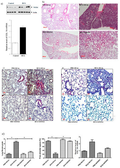NOX4 levels increase in BCG-induced pleurisy lung fibrosis. SiNOX4 post-treatment attenuates the hyperplasia of the visceral pleura, granuloma, and bronchiolitis induced by BCG in the mouse model. (a) Western blotting analyses of NOX4 and Collagen-1A mRNA concentration by RT-PCR. (b) Microscopic examination of lungs at days15 in four groups (PBS + SiCon group, BCG + SiCongroup, PBS + SiNOX4 group, and BCG + SiNOX4 group). Seven mice per group were analyzed. Scale bar: 200 μm. (c) Immunostaining of NOX4 in mouse lungs. Scale bar: 50 μm. (d) Immunostaining of Elastica van Gieson in mouse lungs. (Collagen: red color). Scale bar: 50 μm. (e) Quantification of lung fibrosis and free alveolar space. * p < 0.05. BCG, Mycobacterium bovis bacillus Calmette-Guérin; PBS, phosphate buffered saline; COL1A, collagen 1A.