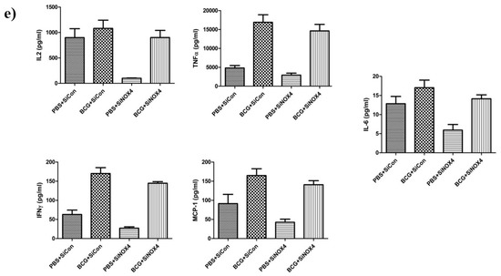 The amount of CFUs in spleens was relatively lower in the BCG + SiNOX4 group compared to the BCG + SiCon group (BCG + SiNOX4: 38460 × 103 ± 74420 × 103 CFU/mL, BCG + SiCon: 947.6 × 103 ± 702.4 × 103 CFU/mL, p = 0.427) (Figure 8c). Microscopic analyses of pleural cells revealed multinucleated giant macrophages in mice in both the BCG + SiCon group and the BCG + SiNOX4 group (Figure 8d). The concentration of cytokines (IL-6, TNFα, IFNɤ, MCP-1, IL-2) in pleural effusion were higher in mice in the BCG + SiCon group than in the PBS + SiCon group, which is consistent with previous studies. A lower expression of cytokines was detected in the pleural effusion of mice in the BCG + SiNOX4 group compared to the BCG + SiCon group (Figure 8e). These results suggest that NOX4 antagonism leads to substantial control of pleural inflammation and infection.