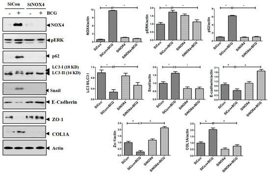 3.8. BCG Upregulates the Expression of ERK and Downregulates Autophagy Signaling via NOX4 Signaling