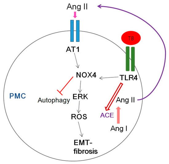 Mycobacterium stimulated NOX4 expression via TLR4 and AT1R significantly induced ERK–ROS-collagen production and attenuated autophagic flux (Figure 4, Figure S1).