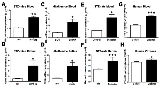 Assessment of Hcy level by enzyme-linked immuno sorbent assay (ELISA). (A) Blood and (B) retina of streptozotocin (STZ)-injected mice showed a significant increase in Hcy level compared to the wild-type (WT) group (* p < 0.05, ** p < 0.01). (C) Blood and (D) retina of genetically obese leptin receptor-deficient mice (db/db) showed a significant increase in Hcy level compared to the WT group (* p < 0.05). (E) Blood and (F) retina of STZ-injected rats showed a significant increase in Hcy level compared to the WT group (* p < 0.05, *** p < 0.001). (G) Blood and (H) vitreous of diabetic patients showed a significant increase in Hcy level compared to the control non-diabetic group (*** p < 0.001, * p < 0.05).