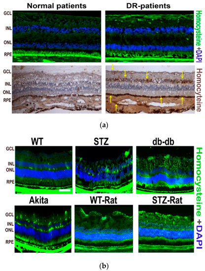 Retinal cryosections were prepared according to our previously published method [28,30]. First, the retinal sections were fixed with 4% paraformaldehyde. The fixation was followed by washing with PBS–Triton X-100, blocking with Power Block (BioGenex, Fremont, CA, USA), and then incubation with an anti-homocysteine antibody (Catalog number; ab5512 rabbit polyclonal, Chemicon International Inc., Temecula, CA, USA) at 37 °C for 3 h or at 4 °C overnight. The sections were subsequently washed with PBS–Triton X-100 three times. Then, the sections were incubated with the appropriate secondary antibody at 37 °C for 1 h. Sections were then washed with PBS–Triton X-100 and Fluoroshield with DAPI (4’6-diamidino-2-phenylindole) was applied, followed by the placement of a coverslip (Sigma Aldrich F6057, Saint Louis, MO, USA) to label the nuclei. Thereafter, sections were examined and images were captured using fluorescent microscopy (Carl Zeiss, Göttingen, Germany).