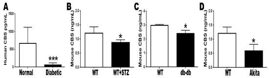 Assessment of cystathionine beta-synthase (CBS) level by ELISA. (A) Serum samples from diabetic patients demonstrated a significant decrease in CBS level compared to the control non-diabetic group (*** p < 0.001). (B) STZ-injected mice, (C) db/db mice and (D) Akita mice demonstrated a significant decrease in blood CBS level compared to corresponding control groups (* p < 0.05).