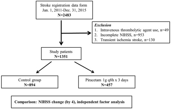 This observational and retrospective cohort study was conducted by collecting 2483 ischemic stroke patients who were admitted to the intensive care unit (ICU) of Tungs’ Taichung MetroHarbor Hospital, a 1200-bed regional teaching hospital located in central Taiwan, from 1 January 2011 to 31 December 2015, and retrospectively reviewed and analyzed from the stroke registration database of the hospital. The study was conducted in accordance with the Declaration of Helsinki, and the protocol was approved by the Institutional Review Board of Tungs’ Taichung MetroHarbor Hospital (107019, V2/2018-05-17). All subjects gave their informed consent. Criteria for ICU admission were based on recommendations of the American College of Critical Care Medicine and the Society of Critical Care Medicine [8]. Patients were excluded if they had an intravenous thrombolytic agent (recombinant tissue plasminogen activator, rt-PA, Actilyse) within 3 hours of symptom onset (n = 49), incomplete or erroneous admission or discharge NIHSS scores (n = 953), or transient ischemia stroke (n = 130) (Figure 1). Of the 1351 cases included in the study, in addition to basic fluid therapy for these patients, 457 received intravenous piracetam (trade name: Nootropil 200 mg/mL, 5 mL/amp; Nang Kuang Pharmaceutical, Taipei, Taiwan) 1 g every 8 h for 3 days and the remaining 894 did not. The piracetan was not randomized to give. No placebo was given. However, patients were not aware whether piracetam was given or not. The epidemiological and comorbidity characteristics of patients with piracetam and without piracetam were assessed if they were balanced based on standardized difference. This study evaluates the association of piracetam treatment with the NIHSS score changes between the admission and discharge date for patients with acute ischemic stroke.