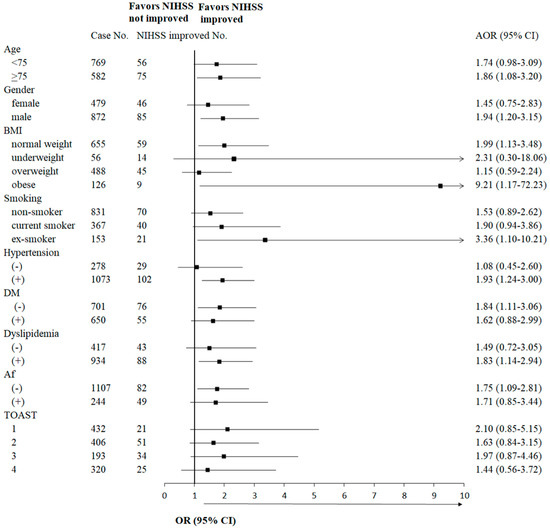 Subgroup analysis of epidemiological and comorbidity variables for the associations of piracetam with NIHSS score improvement. Association of piracetam treatment with NIHSS improvement was evaluated in each subgroup in each category. Logistic regression model was used for statistical analysis. NIHSS, National Institute of Health Stroke Scale; BMI, body mass index; DM, diabetes mellitus; Af, atrial fibrillation; TOAST, Trial of Organization 10,172 in Acute Stroke Treatment classification; 1, small-vessel occlusion; 2, large-artery atherosclerosis; 3, cardioembolism; 4, others; (−), negative; (+), positive; AOR, adjusted odds ratio, adjusted among the categories including age, gender, BMI, smoking habit, hypertension, DM, dyslipidemia, Af and TOAST; 95% CI, 95% confident interval.