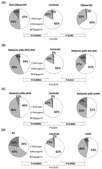 When the analysis was performed according to the onset of the disease, both the PPO-IHH and AO-IHH patients showed a similar and statistically significant higher prevalence of rare variants than controls (Figure 1). We found no relevant differences in the prevalence of oligogenic defects in the two groups of cases (p = 0.38) and controls (p = 0.19 with PPO-IHH, p = 0.053 with AO-IHH).