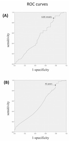 Receiver-operating characteristic (ROC) analysis of (A) total testosterone levels, and (B) age of onset, as indicators of the presence of rare variants in IHH genes. ROC curves were not significant “per se” but were used to find sensitive cutoffs able to identify patients with significantly higher risk of carrier status.