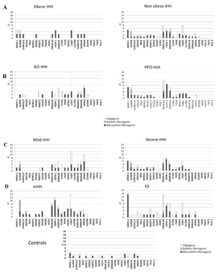 Distribution of rare variants among the 28 candidate genes in the different IHH groups. Showed according to the presence of obesity (A), age of IHH onset (B), TTe levels (C) and olfactory defects (D). IHH (isolated hypogonadotropic hypogonadism), AO (adult onset), PPO (prepubertal onset), mIHH (mild IHH), sIHH (severe IHH), KS (Kallmann’s Syndrome), nIHH (normoosmic IHH). Rare variants of ANOS1 were found only in two female controls; no male subject had a rare variant in ANOS1 among controls.