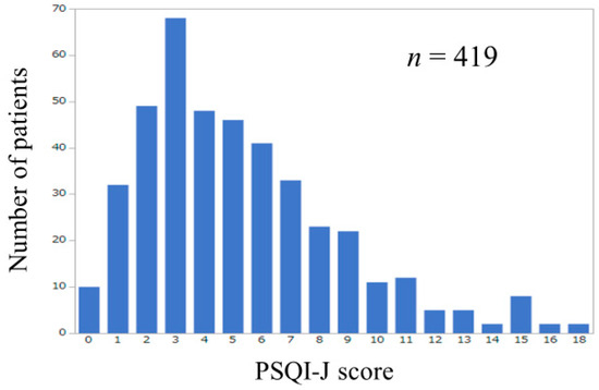 Baseline characteristics in our study (n = 419, 200 men and 219 women, median age = 64 years) were presented in Table 2. The number of patients according to PSQI-J score was shown in Figure 1. The median (range) PSQI-J score was 5 (0–18). PSQI-J score 0–5 (normal) was found in 253 (60.4%), 6–8 (mild) in 97 (23.2%), 9–11 (moderate) in 45 (10.7%) and 12 or more (severe) in 24 (5.7%) [11]. Sleep disturbance with PSQI-J score 6 or more was thus observed in 166 patients (39.6%). The median (range) GS and SMI in male patients were 34.3 kg (6.6–57.8 kg) and 7.5 kg/m2 (5.2–11.0 kg/m2) and those in female patients were 20.1 kg (5.9–36.1 kg) and 5.9 kg/m2 (3.9–8.1 kg/m2). Sarcopenia (i.e., type A) as defined by the JSH criteria was observed in 27 male patients (13.5%) and 34 female patients (15.5%) [21]. Among type A, B, C and D, overall differences were noted with statistical significance in age, gender, presence of LC, body mass index (BMI), serum albumin, prothrombin time, platelet count, total cholesterol, estimated glomerular filtration rate and PSQI-J score (Table 2). The median (range) PSQI-J score in LC patients (5 (0–18)) was significantly higher than that in non-LC patients (4 (0–15)) (P = 0.0046), suggesting the poorer sleep quality in LC patients compared with non-LC patients. The median (range) PSQI-J score in male patients (4 (0–16)) was significantly lower than that in female patients (5 (0–18)) (P = 0.0420). The median (range) PSQI-J score in patients aged 65 years or more (4.5 (0–18)) was similar to that in patients aged less than 65 years (5 (0–18)) (P = 0.5118).