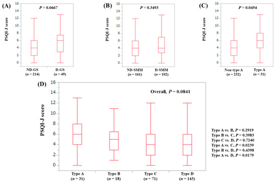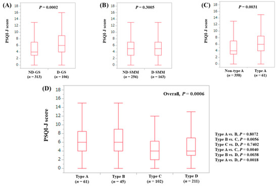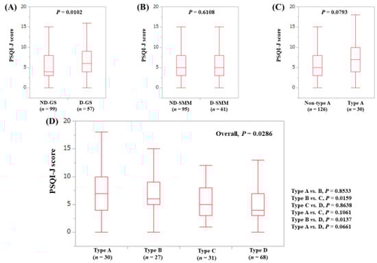PSQI-J score stratified by GS and SMM for all cases (n = 419). (A) Non-decreased GS vs. decreased GS. (B) Non-decreased SMM vs. decreased SMM. (C) Non-type A (type B, C and D) vs. type A. (D) Comparison among four types (type A, B, C and D).