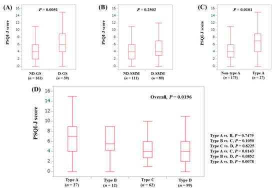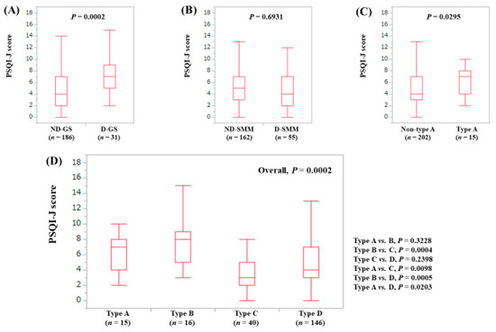The median (range) PSQI-J score in the D-GS (7 (2–16), n = 31) was significantly higher than that in the ND-GS (4 (0–18), n = 186) (P = 0.0002). (Figure 8A) The median (range) PSQI-J score in the D-SMM (4 (0–16), n = 55) was identical to that in the ND-SMM (5 (0–18), n = 162) (P = 0.6931). (Figure 8B) The median (range) PSQI-J score in type A (7 (2–16), n = 15) was significantly higher compared with non-type A (4 (0–18), n = 202) (P = 0.0295). (Figure 8C) In comparison among four types, the overall difference was noted with significance (P = 0.0002). (Figure 8D).