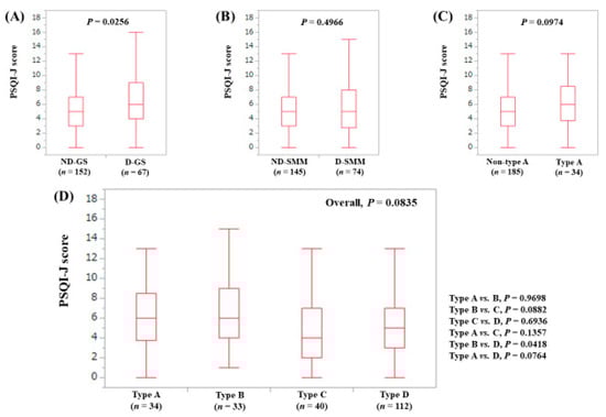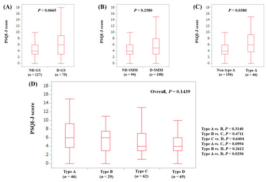 The median (range) PSQI-J score in the D-GS (6 (0–18), n = 75) tended to be significantly higher than that in the ND-GS (4 (0–16), n = 127) (P = 0.0665), (Figure 7A). The median (range) PSQI-J score in D-SMM (5 (0–18), n = 108) was equal to that in the ND-SMM (4 (0–15), n = 94) (P = 0.2580), (Figure 7B). The median (range) PSQI-J score in type A (6 (0–18), n = 46) was significantly higher compared with non-type A (4 (0–16), n = 156) (P = 0.0380), (Figure 7C). In comparison among four types, the overall difference was not significant (P = 0.1439), (Figure 7D).