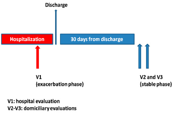 Every patient underwent three identical evaluation sessions in the following order (Figure 1): one session during hospital stay (V1), considered as an evaluation in an exacerbation phase, and two sessions at home (V2 and V3), considered as evaluations in a stable phase. V1 was carried out after the corresponding physician authorized the patient to walk (namely, after the most severe part of the process had passed). Thirty days after discharge, one of the research physicians contacted the participant via telephone to check whether he/she was in a stable phase. To this end, a questionnaire was administered, asking the patients whether, compared to the moment of hospital discharge, they had experienced increased cough, sputum, or dyspnea; increased the dose or re-started a corticoid therapy, initiated an antibiotic treatment, or visited the doctor due to the worsening of any clinical condition. If the answer to any of these questions was “yes”, it was considered that the patient was not in a stable state. In such case, sessions (V2, V3) were postponed until the researcher considered, based on successive telephone calls, that the patient was in a stable state. Sessions V2 and V3 were scheduled with at least 24 h between them.
