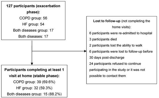 A total of 127 participants were recruited (56 with COPD exacerbation, 54 with HF exacerbation and 17 with exacerbation of both conditions). Figure 2 shows the number of participants who completed the follow-up and the reasons behind cases lost to follow-up. Table 1 shows the baseline results per HF or COPD condition.