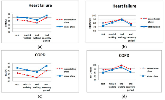 HR and SaO2 during evaluation sessions. (a,b): SaO2 and HR of HF patients, respectively; (c,d): SaO2 and HR of COPD patients, respectively.