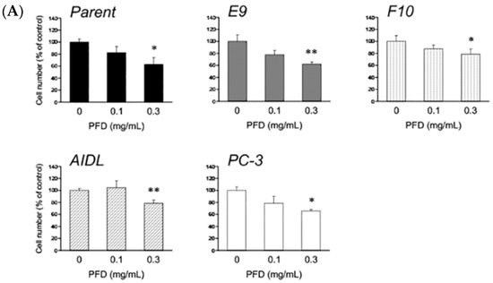To assess cell viability after the PFD treatments, LNCaP, E9, F10, AIDL, and PC-3 cells were plated in 12-well plates at 5 × 104 to 1 × 105 cells/well. PFD (0.1 and 0.3 mg/mL) or vehicle-only (0.1% dimethyl sulfoxide [DMSO]) was added on day two, and the cells were cultured for an additional three days. The cells were detached by trypsinization and counted using the Countess II Automated Cell Counter (Thermo Fisher Scientific Inc., Waltham, MA, USA). Cell viability was assessed by trypan blue exclusion assay.