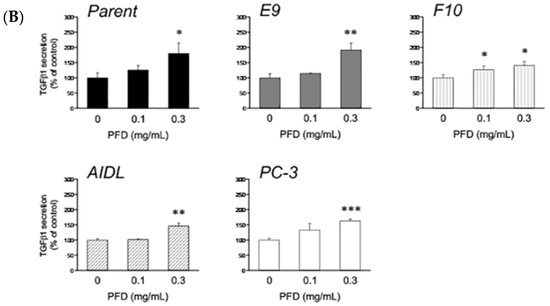 First, we confirmed that PFD treatment suppresses the growth of fibroblasts. PFD treatment (0.3 mg/mL) for 72 h suppressed the growth of commercially available prostate stromal cells (data not shown). Using these experimental conditions, we treated the PCa cells (LNCaP, E9, F10, AIDL, and PC-3) with PFD and found that PFD treatment suppressed the growth of all cell lines (Figure 1A). Among the LNCaP cells and sublines, growth suppression was more pronounced in LNCaP and E9 cells than in F10 and AIDL cells. We also assessed TGFβ1 secretion from PCa cells because of its relationship to cell cycle and apoptosis. TGFβ1 levels were measured in the culture medium of the PCa cells using ELISA. TGFβ1 secretion was significantly increased by PFD treatment in all PCa cells evaluated (Figure 1B). Among the LNCaP cells and sublines, the increase in TGFβ1 secretion was greater in LNCaP and E9 cells than in F10 and AIDL cells.