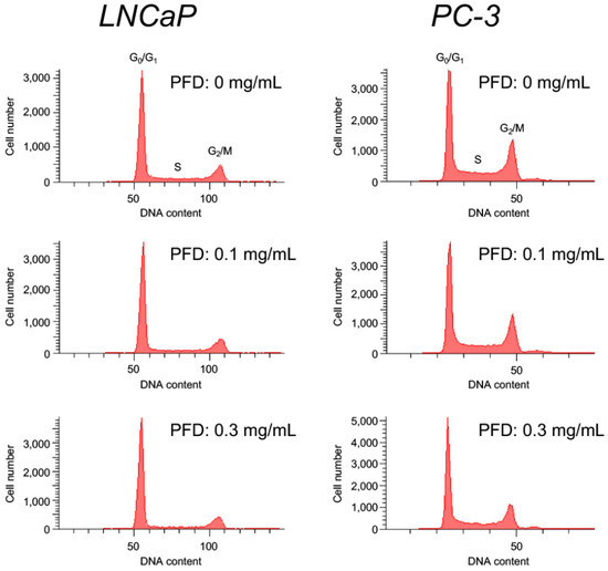 LNCaP or PC-3 cells (1.5 × 105 cells) were seeded into 100-mm culture dishes (Sumitomo Bakelite Co., Ltd., Tokyo, Japan). Twenty-four hours after seeding, the cells were treated with 0.1 or 0.3 mg/mL PFD or vehicle (0.1% DMSO) for 24 h. After treatment, the cells were isolated, and the nuclei were stained using the BD Cycletest Plus DNA Reagent Kit (BD Biosciences, San Jose, CA, USA). To determine the cell cycle distribution, the DNA content of the stained cells was analyzed using the BD FACS Canto II flow cytometer (BD Biosciences), as described previously [28].