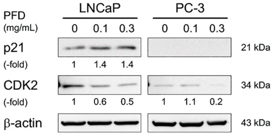 To investigate whether PFD treatment affects the cell cycle, we performed flow cytometric and Western blot analyses of cell-cycle regulatory proteins. In both LNCaP and PC-3 cells, PFD treatment increased the population of cells in the G0/G1 phase, which was accompanied by a decrease in S/G2 phase cells (Figure 2, Table 1 and Table 2). p21 protein expression was increased by PFD treatment in LNCaP cells, but was not detected in PC-3 cells (Figure 3). Of note, PFD-increased p21 protein expression was the highest in E9 cells (Figure S1). In contrast, CDK2 protein expression was clearly decreased in both PFD-treated LNCaP and PC-3 cells. Of note, PFD treatment did not induce early apoptosis in either LNCaP or PC-3 cells.