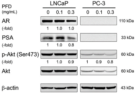 Lin et al. reported that the Akt pathway is associated with AR activation in LNCaP cells [38]. Iguchi et al. demonstrated that inhibition of Akt phosphorylation by the PI3K inhibitor LY294002 reduced PSA expression in LNCaP cells [39]. Previous studies reported that PFD treatment inhibits phosphorylation of Akt in rat hepatocytes [40], human lung fibroblasts [30], and human Tenon fibroblasts [16]. Similarly, in this study, PFD treatment slightly inhibited the phosphorylation of Akt in both LNCaP and PC-3 cells. In addition, PFD treatment reduced PSA protein expression and secretion in LNCaP cells.
