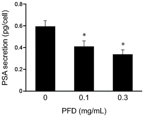 We further evaluated the effects of PFD treatment on PSA secretion by measuring PSA protein levels in conditioned medium from PFD-treated LNCaP cell cultures using ELISA. The PSA protein level was significantly reduced in LNCaP cell culture medium, suggesting that PSA secretion was inhibited by PFD treatment (Figure 5).