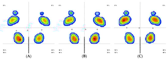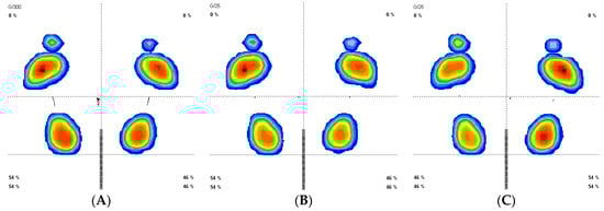 Plantar pressures pattern before and after stretching (prior (A), post continuous stretch (B), and post intermittent stretch(C)).