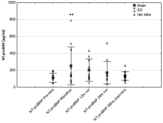 Ultra-marathon-induced changes in serum N-terminal pro-brain natriuretic peptide (NT-proBNP) ** p < 0.01 versus the corresponding pre-race value (Pre-race).