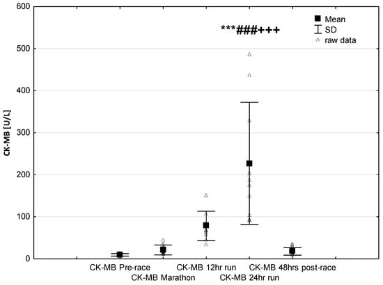 Ultra-marathon-induced changes in serum creatinine kinase-myocardial band (CK-MB). *** p < 0.001 versus the corresponding pre-run value (Pre-race); ### p < 0.001 versus the corresponding post-marathon value (Marathon); +++ p < 0.001 versus the corresponding post 12-h run value (12-h run).
