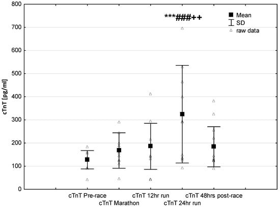 Ultra-marathon-induced changes in serum cardiac specific troponin T (cTnT). *** p < 0.001 versus the corresponding pre-race value (Pre-race); ### p < 0.001 versus the corresponding post-marathon value (Marathon); ++ p < 0.01 versus the corresponding post 12-h run value (12-h run).