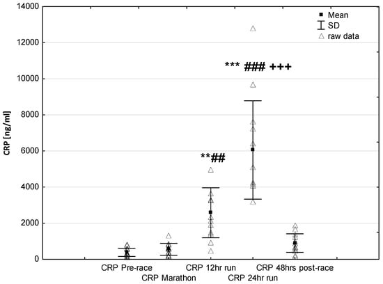 Ultra-marathon-induced changes in serum high sensitive C-reactive protein (hsCRP). ** p < 0.01, *** p < 0.001 versus the corresponding pre-race value (Pre-race); ## p < 0.01, ### p < 0.001 versus the corresponding post-marathon value (Marathon); +++ p < 0.001 versus the corresponding post 12-h run value (12-h run).