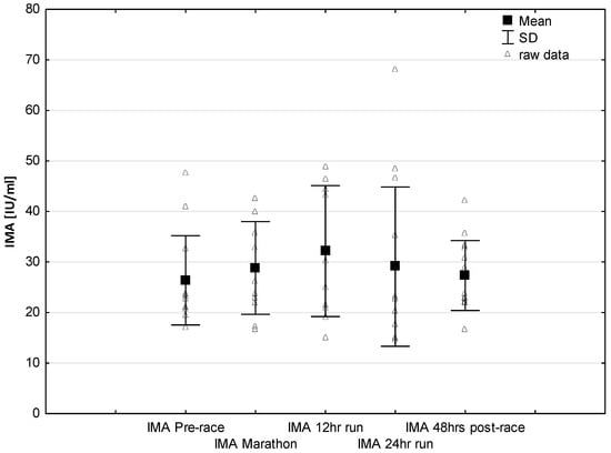 Interestingly, no significant effects were found in the ischemia-modified albumin (IMA) levels after 24 h of running (Figure 5) with increasing trend to higher values during marathon and 12-h run. The lack of significant higher IMA levels after ultra marathon distance vs. pre-race vales could be explained by the presence of other mechanisms responsible for training-induced cardio protection include increased shock proteins levels or increased myocardial antioxidant capacity in elite endurance trained athletes. Previous studies reported IMA is an early marker of myocardial ischemia in the diagnosis of coronary artery disease [,]. It was revealed that IMA levels may increase during myocardial ischemia as seen during strenuous exercise []. A release of this marker may result after an increased oxidative stress caused by ischemia reperfusion injury or other mechanisms responsible for a reduction in the coronary blood flow []. It is worth to note that previous study also demonstrated that IMA levels decrease after physical exercise, and it was hypothesized that this decrease may have been attributed to hemoconcentration or lactate levels []. Further studies are required to identifying the role of this cardiac biomarker for the diagnosis of myocardial ischemia following ultra-endurance exercise.