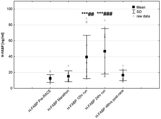 Ultra-marathon-induced changes in serum heart-type fatty acid binding protein (H-FABP). *** p < 0.001 versus the corresponding pre-race value (Pre-race); ## p < 0.01, ### p < 0.001 versus the corresponding post-marathon value (24-h run).
