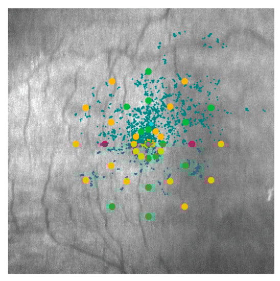 For the evaluation of fixation, the MAIA microperimeter uses high-speed eye trackers (25 Hz). The parameters that evaluate fixation are assessed by tracking eye movements 25 times/Sec and by plotting the resulting distribution over the SLO (Scanning Laser Ophthalmoscope) image. Each movement is represented by a point in the distribution which will constitute the fixation pattern (Figure 1). All fixation positions during the examination are used by the instrument to calculate the fixation indexes P1 and P2, which represent the percentage of fixation points inside a circle of 2 and 4 degrees of diameter from the total of fixation points, respectively. Subjects were classified as having stable fixation if P1 was more than 75%, relatively unstable fixation if P1 was less than 75% and P2 more than 75%, and unstable fixation if both P1 and P2 were below 75%. Microperimetry also provides a more accurate estimation of the fixation pattern using the bivariate contour ellipse area (BCEA). It calculates, by using two orthogonal diameters that describe the extent of the fixation points (in degrees), the area and orientation of an ellipse encompassing a given proportion of the fixation points. Lower BCEA values define better fixation stability. We have selected the BCEA corresponding to 95% of the fixation points [38,39]. For retinal sensitivity and fixation, data corresponding to the right eye were used, which was the first eye explored in all subjects. The duration of the measurements varies from 1 min to 4 min approximately, depending on the subject.