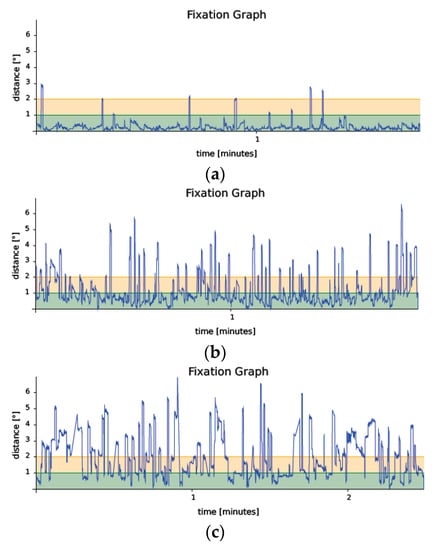 Representative examples of the fixation graph close to the median BCEA95 value of a normocognitive (a) (BCEA95 3.1°), MCI (b) (BCEA95 34.7°) and AD (c) (BCEA95 40.4°) subject. The green and the orange bands represent a circle of 1 and 2 degrees respectively.