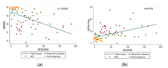 Linear regression graphs between: (a) Mini-mental State Examination (MMSE) and BCEA95; (b) Alzheimer’s Disease Assessment Scale-Cognition subscale (ADAS-Cog) and BCEA95.
