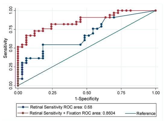 Comparison of two prediction models for MCI versus normal cognition, one based on retinal sensitivity and fixation parameters P1 and BCEA95, and one with retinal sensitivity alone.