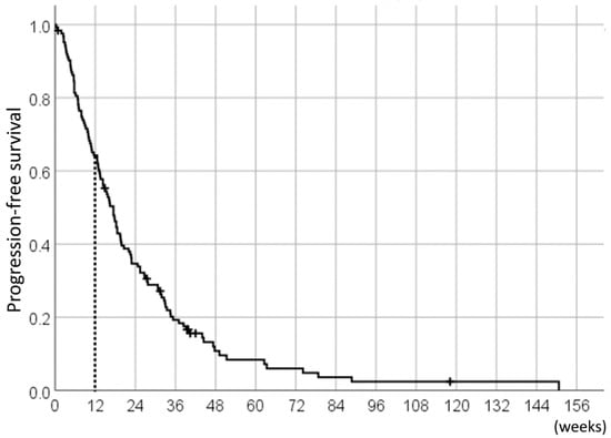 With the median follow-up duration of 38.3 weeks (range: 3.4–234.9 weeks), the median PFS of the 124 pazopanib-treated STS patients was 17.4 weeks (95%CI 14.4–20.5) (Figure 1); of these, the 78 patients (63%) who achieved 12W-PFS were included in the analyses as pazopanib responders.